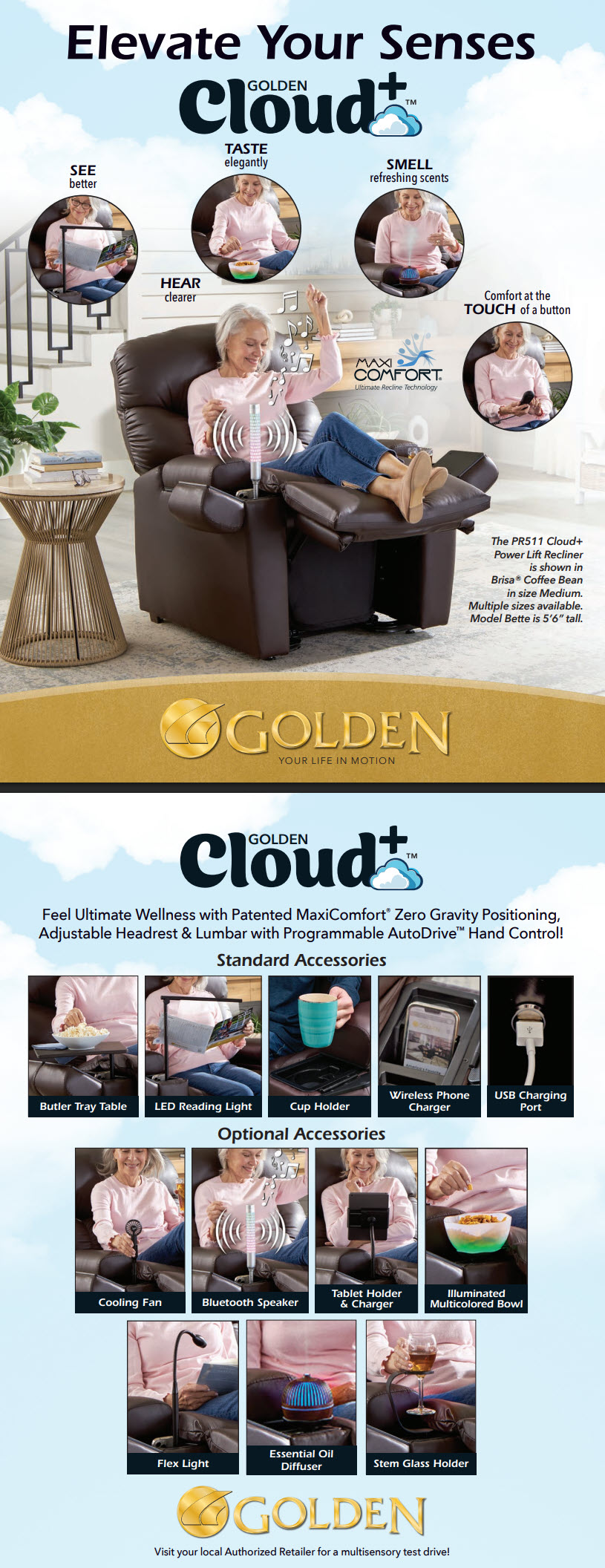 Relax and recharge in comfort and style with the Cloud+ Power Lift Recliner. The Cloud+ features a stylish top load, an open-arm design with a plush seamed back and our popular posture-encouraging bucket seat to conform to your body