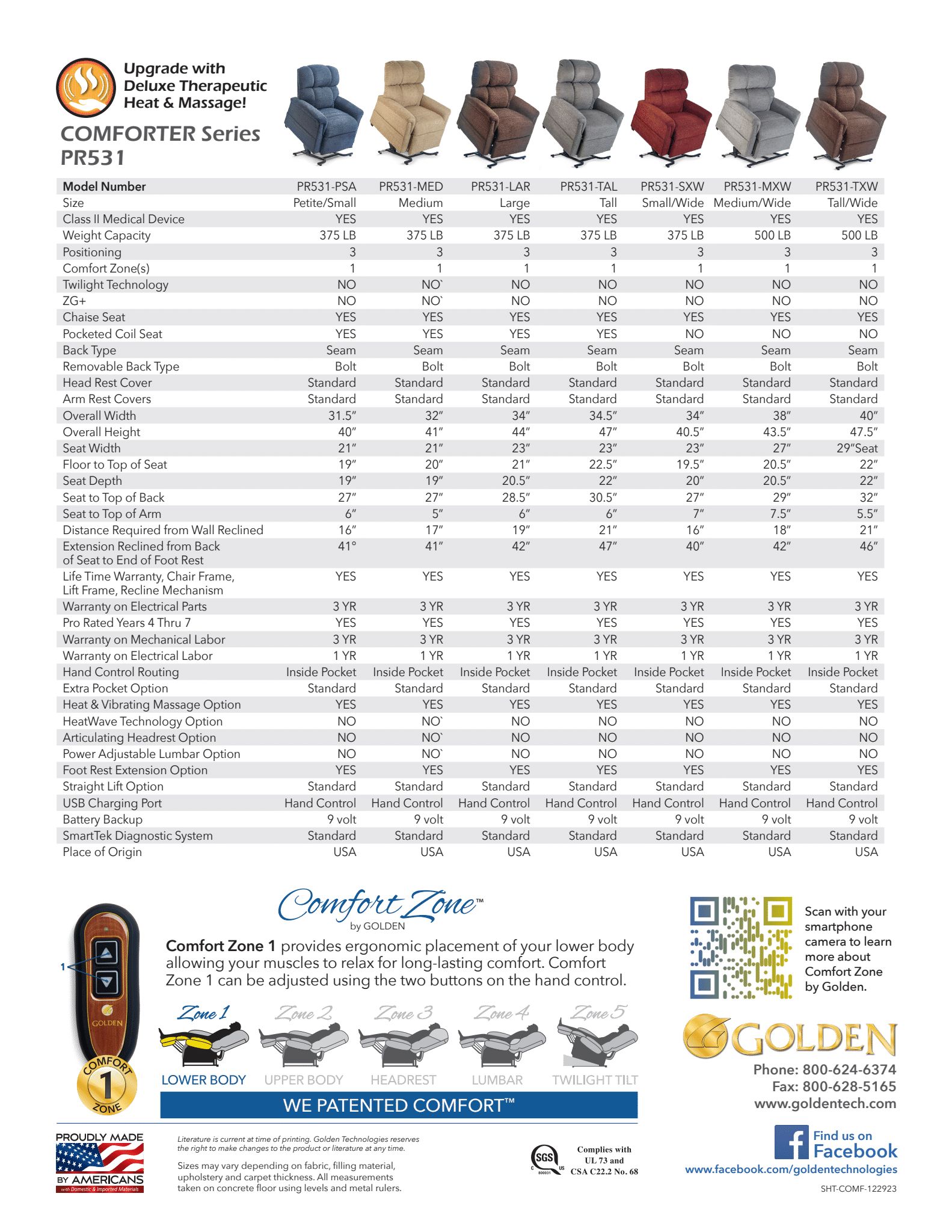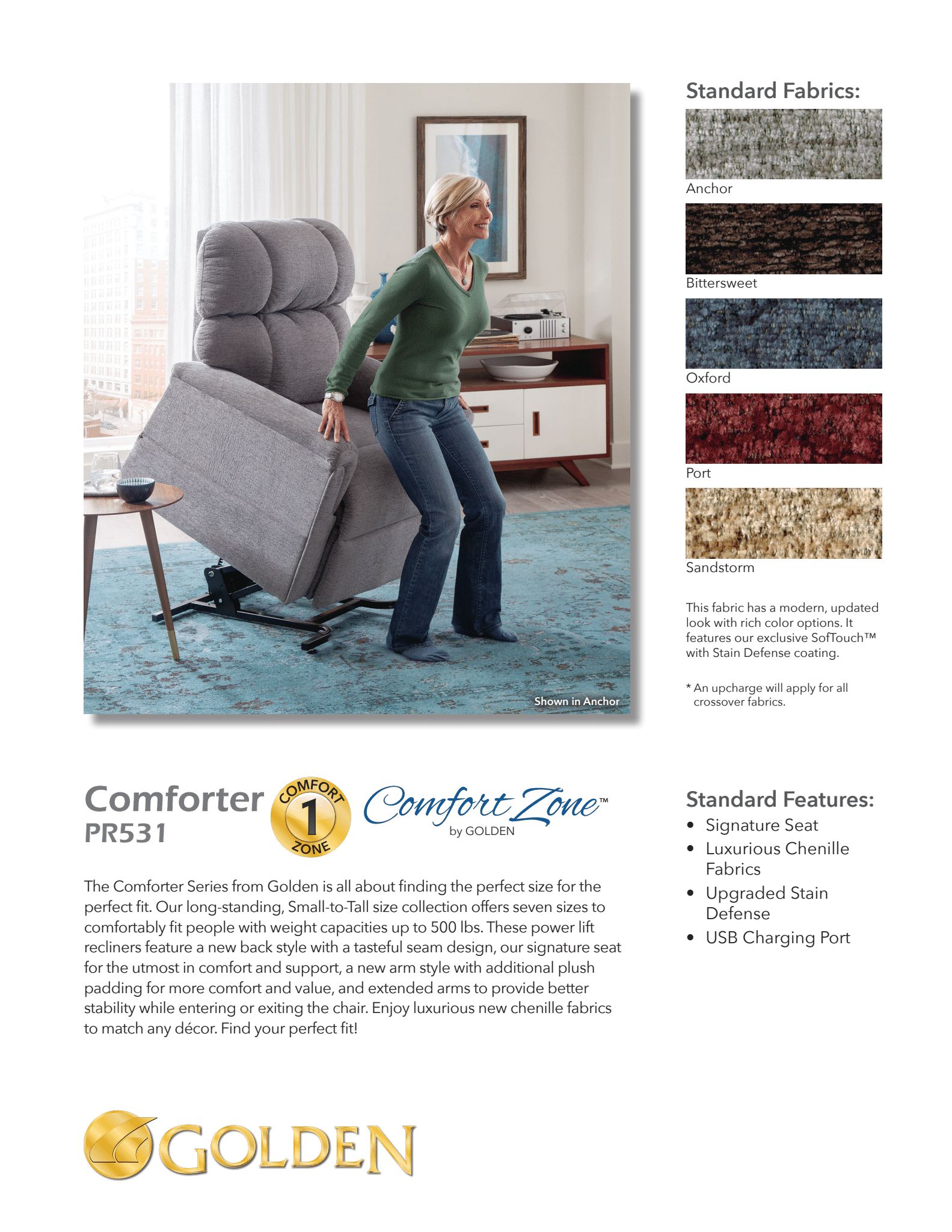 Whether you’re under 5'0" to 6'8" and 300 to 375 lbs., the Comforter Series from Golden Technologies has just your size — actually four sizes. Featuring a plush seamed backrest with lumbar support, a soft, comfortable seat with Pocketed Coil Springs, and our "grip rite" arm design, the Comforter series gives you the perfect fit.